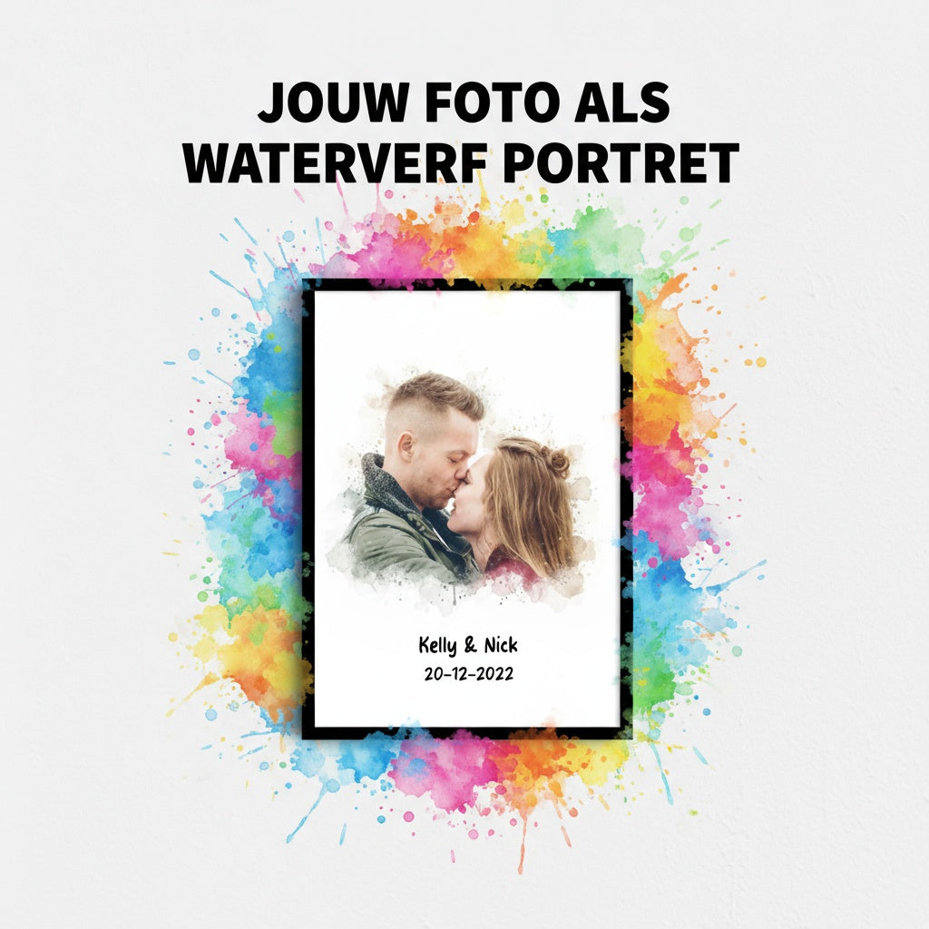 Van foto naar kunstwerk: upload je afbeelding, vul twee persoonlijke tekstregels in, kies het formaat en de omlijsting en ontvang een stijlvol waterverf-portret dat perfect past in jouw interieur.