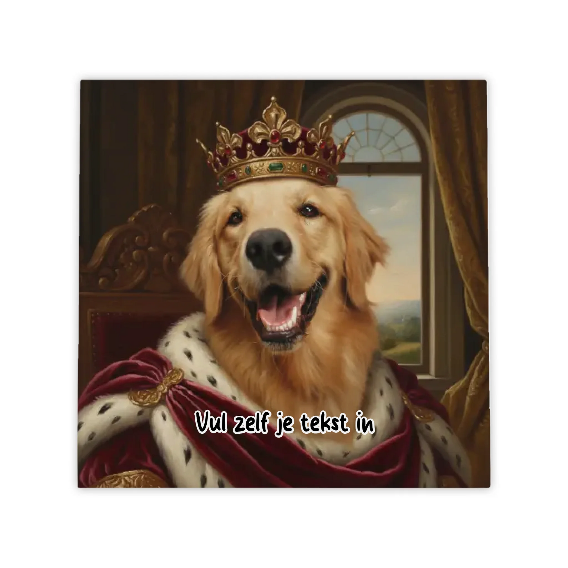 Geef je trouwe viervoeter de koninklijke behandeling die hij of zij verdient! Transform jouw huisdier in een statig olieverfschilderij op een hoogwaardige keramische tegel, compleet met fluweelzachte koninklijke mantel en gouden kroon.