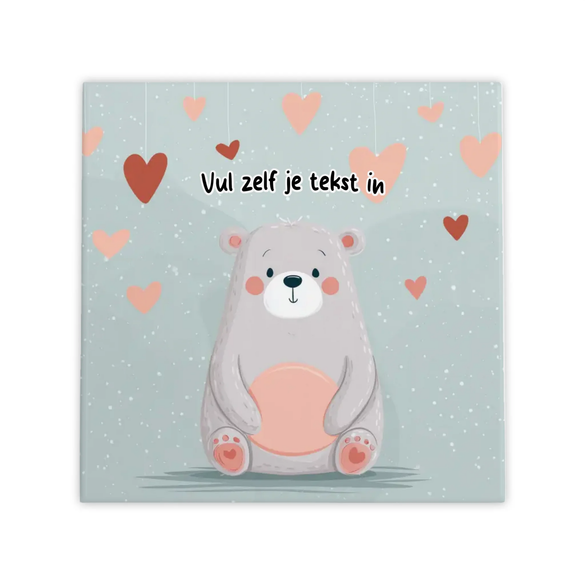 Dit allerliefste beertje met zwevende hartjes brengt pure warmte en liefde naar elke kinderkamer! Perfect voor geboortetegels, valentijnscadeaus, of gewoon omdat je kleintje het verdient. Volledig personaliseerbaar met jouw eigen tekst!