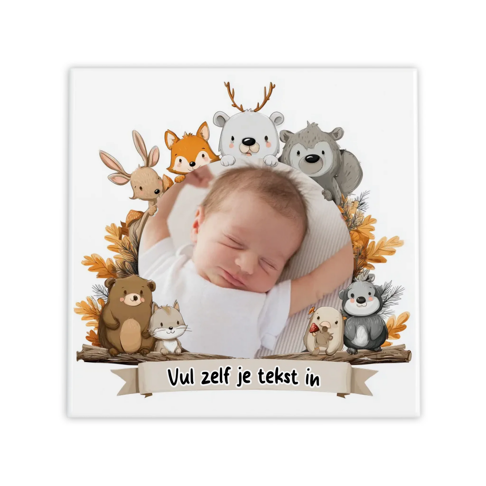 Vier de komst van je kleintje met deze hartverwarmende geboortetegel! Jouw baby foto omringd door een verzameling schattige bosdiertjes – van speelse vosjes tot lieve konijntjes, rendieren, beertjes en wasberen. Perfect voor de babykamer, kinderkamer of als blijvende geboorteherinnering!