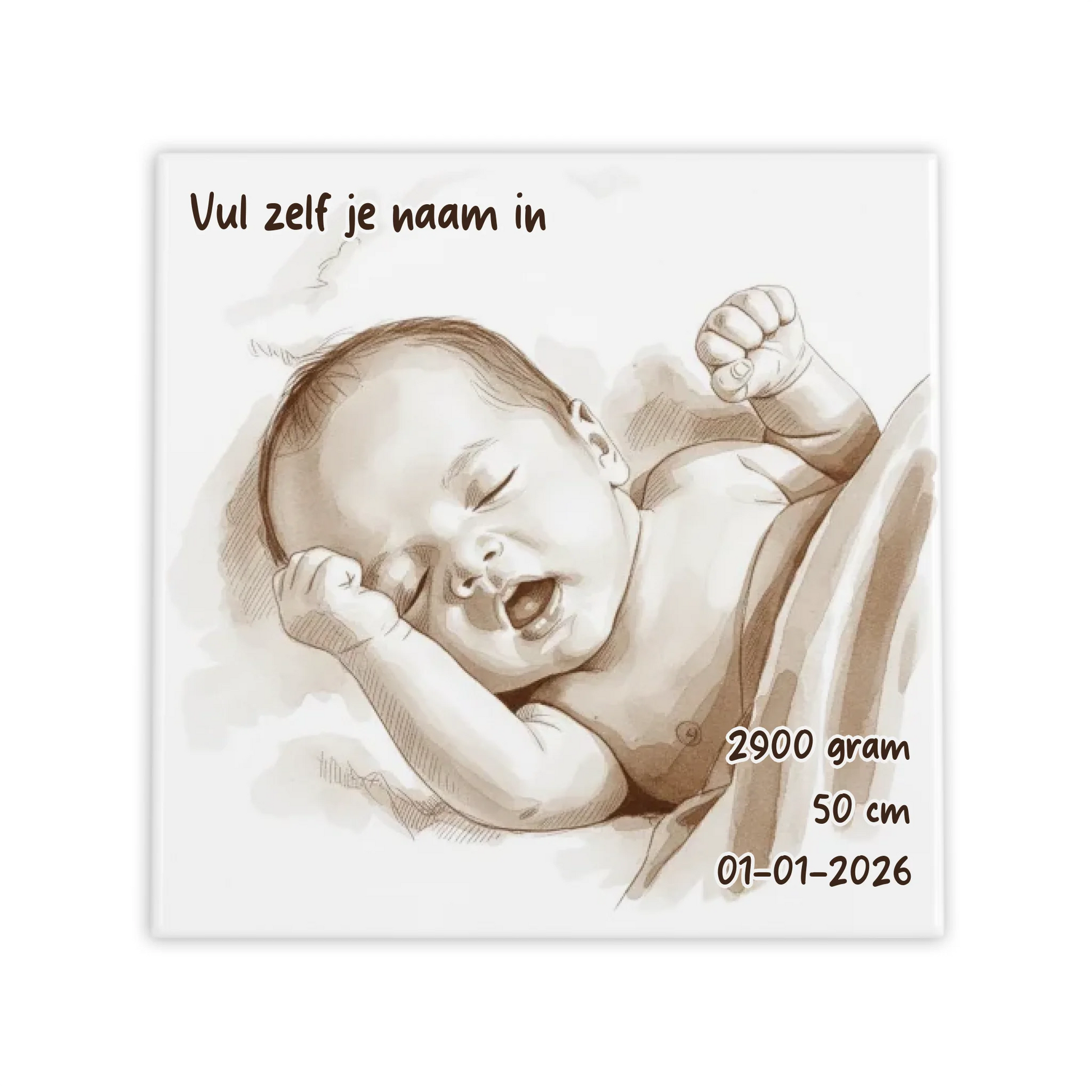 Transformeer je mooiste babyfoto in een prachtige sepia sketch op hoogwaardige tegel. Die tijdloze, warme vintage uitstraling met het karakter van een handgetekende schets – compleet met naam, gewicht en lengte. Perfect voor een klassieke geboorteherinnering!