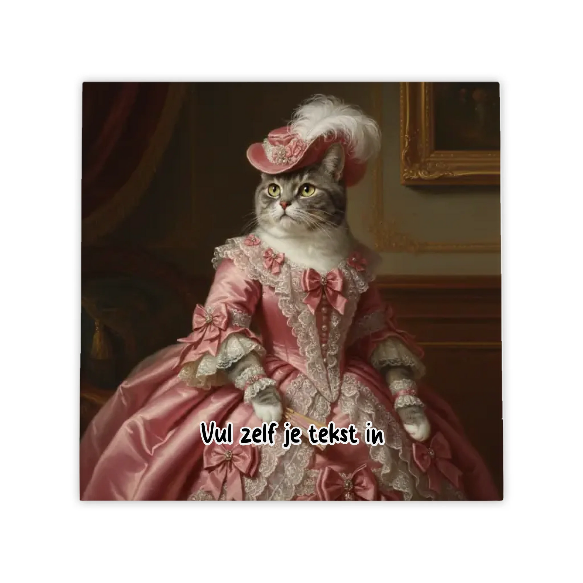 Transformeer je trouwe viervoeter in een ware aristocraat uit het Victoriaanse tijdperk! Compleet met luxueuze roze jurk vol kant en strikken, een sierlijke hoed met veren, en natuurlijk een elegante waaier in de poot. Museum-waardige kunst met een vleugje humor - perfect voor liefhebbers van klassieke portretten én hun huisdieren!